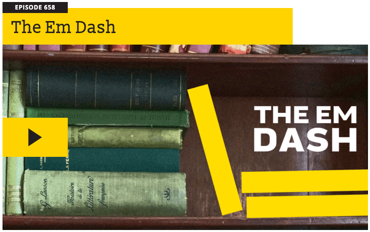 The episode goes into the history of the em dash starting with it’s creation by 11th century Italian Boncompagno da Signa, who also created the comma. The dash started getting heavier use with the rise of fictional realism that began in 17th and 18th century Europe. Shakespeare loved the dash – so I’m in good company – and the works like Moby Dick and other great works are full of the dash. The poetry of Emily Dickinson is replete with dashes.